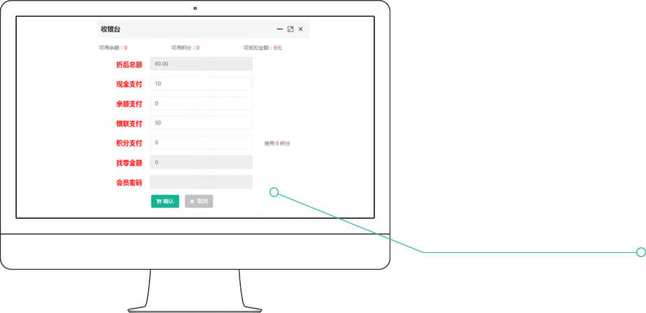 进入支付界面,可进行余额、现金、积分等多种支付方式;商品消费,选择或者扫描商品,点击结算或者挂单;